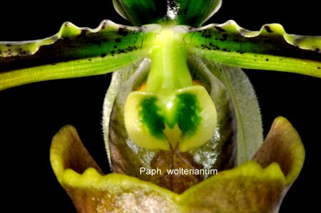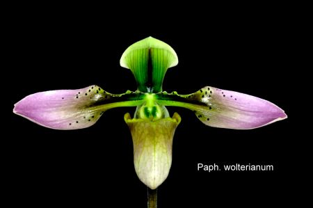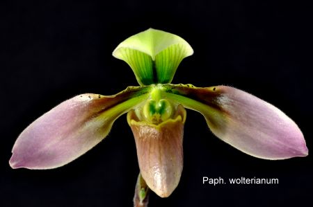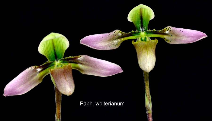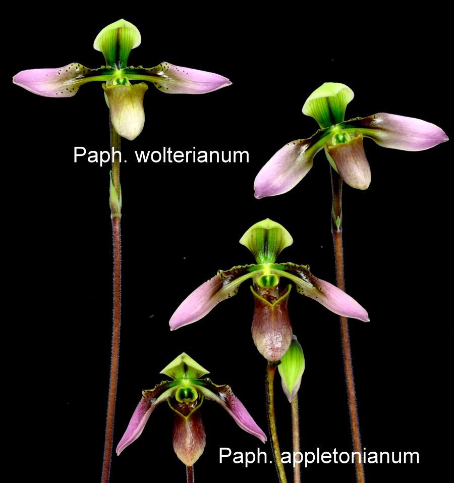 It is often difficult to distinguish between these two species. Some taxonomists consider Paph. wolterianum to be a synonym of Paph. appletonianum, although there are clear differences in flower posture, flower stalk length, staminode, leaf, and habitat.