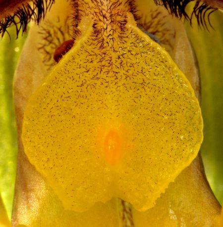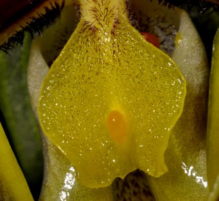 The coloration of the Paph. coccineum has likely faded slightly – the flower fell off only two days after the photo was taken.
