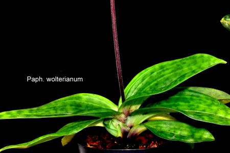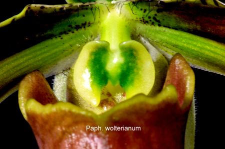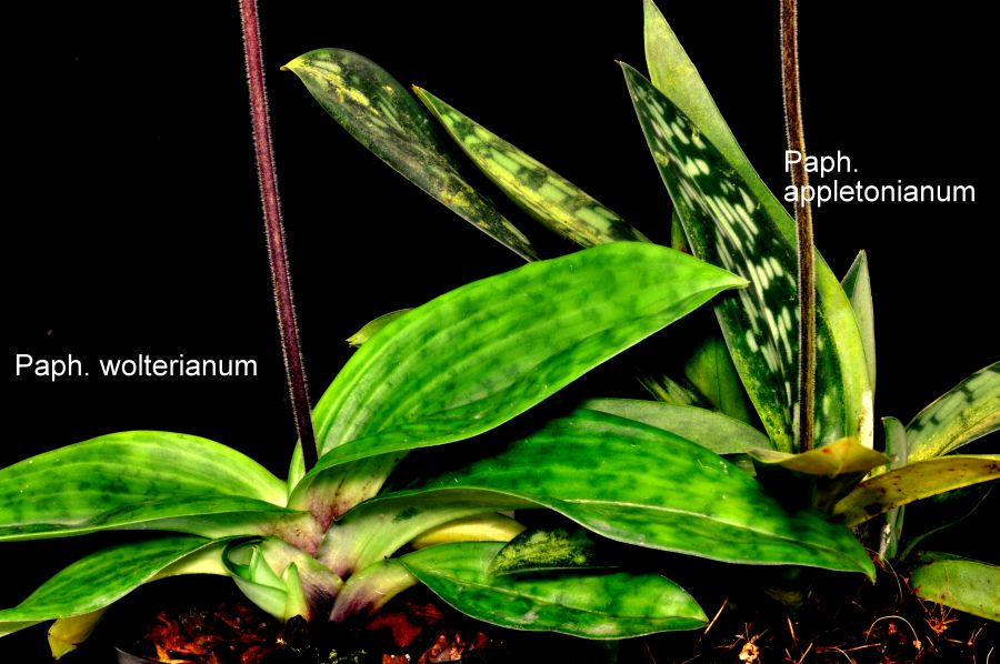 It is often difficult to distinguish between these two species. Some taxonomists consider Paph. wolterianum to be a synonym of Paph. appletonianum, although there are clear differences in flower posture, flower stalk length, staminode, leaf, and habitat.