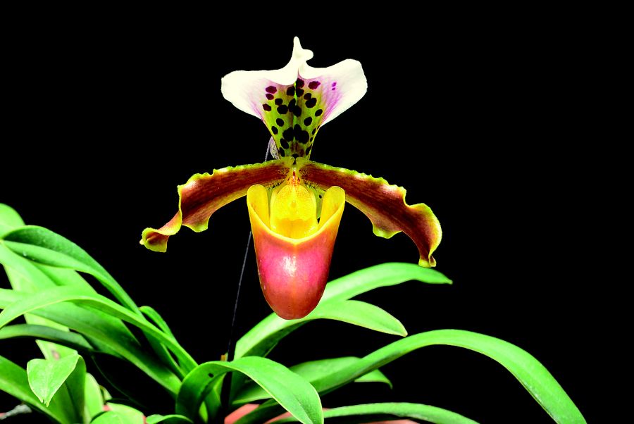 Diese Pflanze sieht dem Paph. henryanum sehr ähnlich - es könnte auch eine Naturhybride mit Paph. barbigerum sein (Paph. x aspersum).